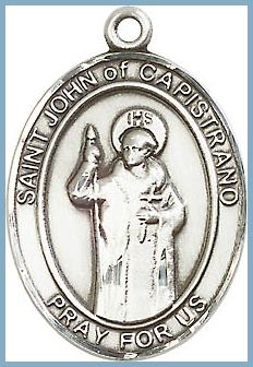 This St John medal is a sterling silver saint pendant with chain options and gift box. This medium size is appropriate for girls, women, young boys, and men who prefer smaller religious jewelry. This Catholic medal would make a nice gift for a candidate who chose John of Capistrano for a Confirmation name, or for anyone with a devotion to him. He is a patron saint of judges, lawyers, jurists, and military chaplains. His feast day is October 23. We can personalize the back of the pendant for you.